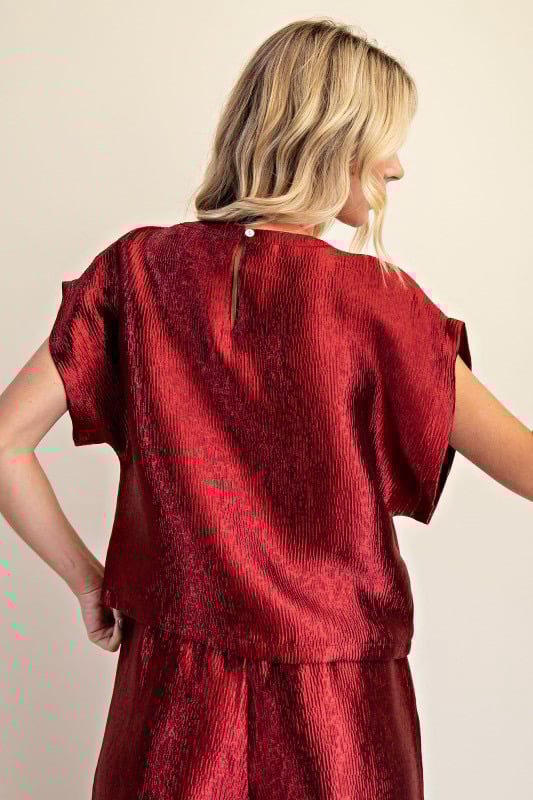 Medium crop shirt with button tie in the back. exact match for our wide leg wine color pants.